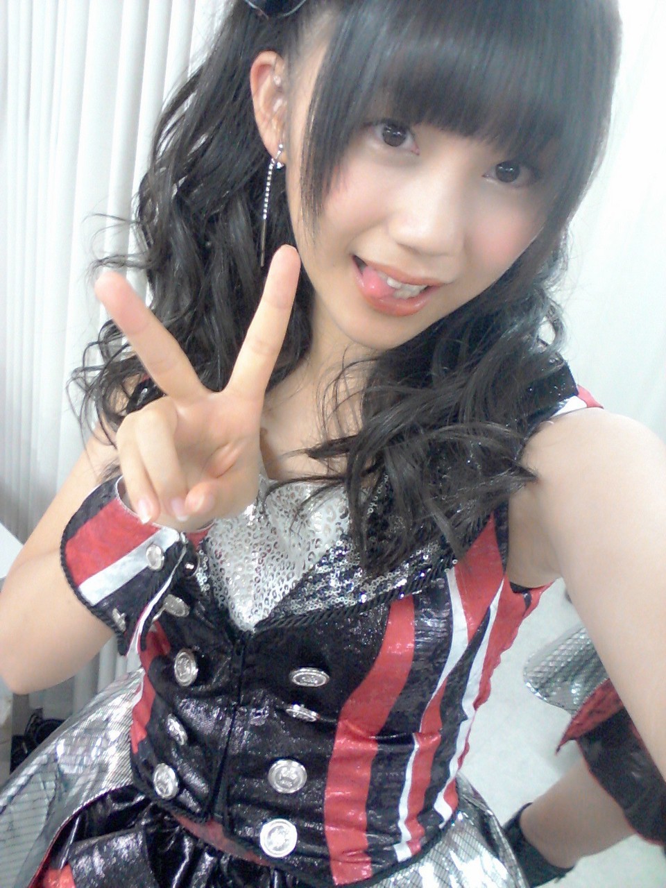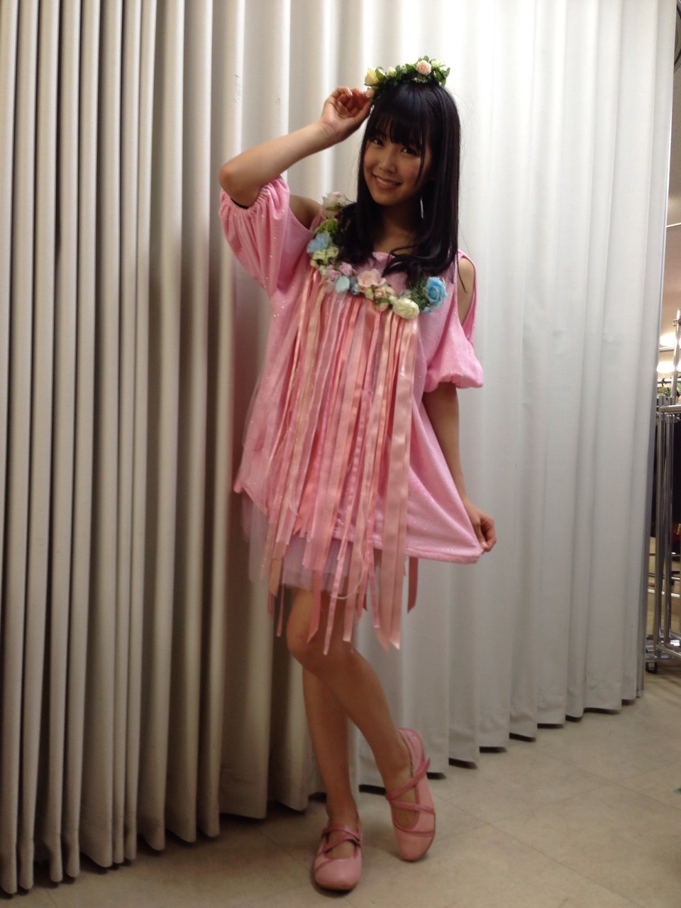 写真のオープニング衣装の髪飾りに何か付いてるよ。