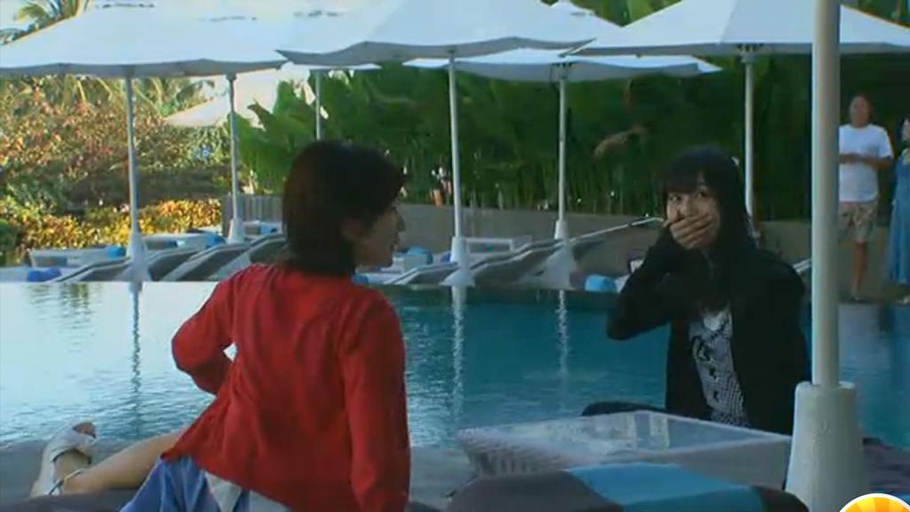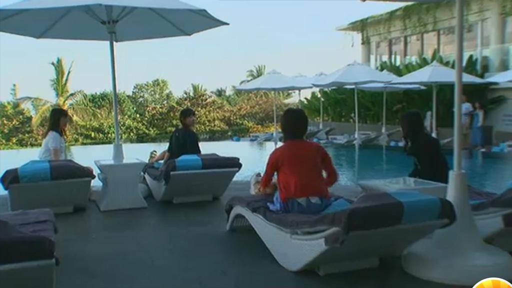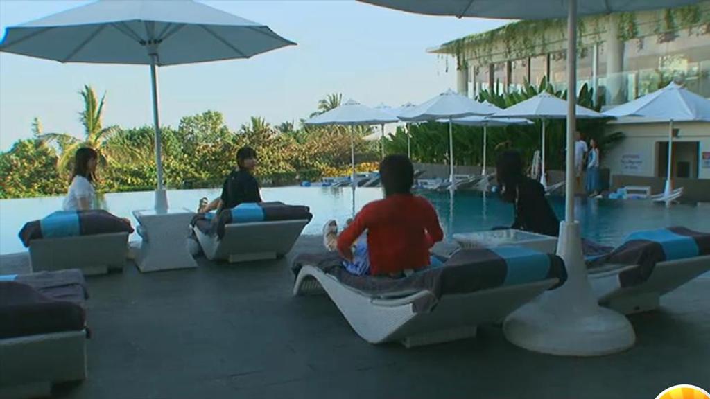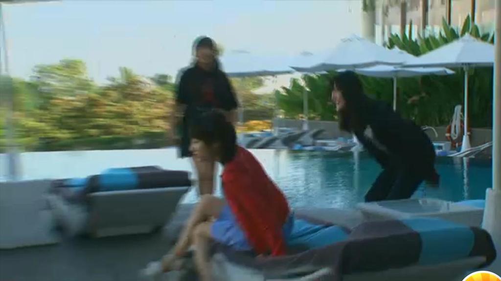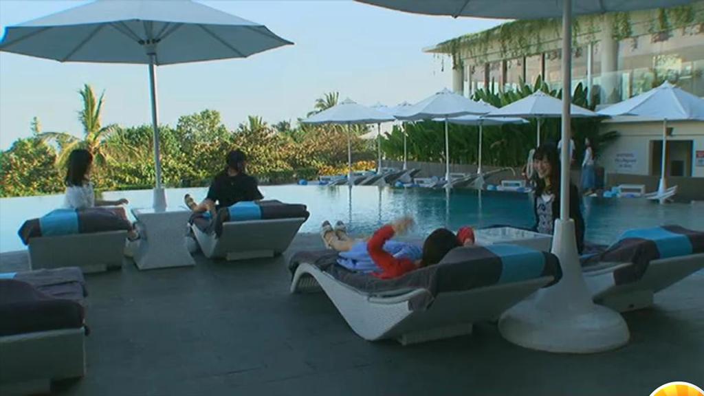 4人ともプールで寝てる