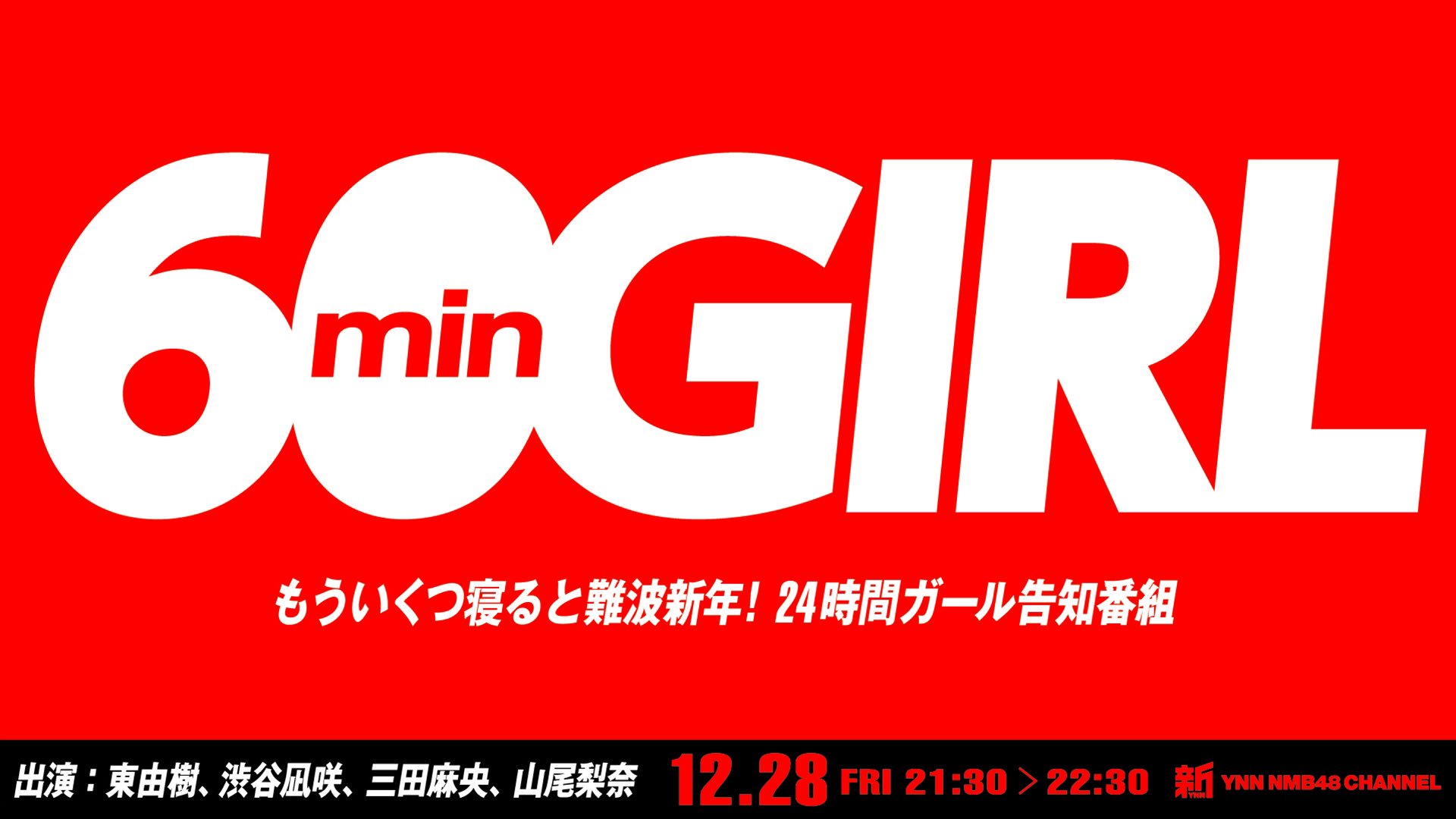 12/28(金)21:30から #新YNN にて、もういくつ寝ると難波新年!24時間ガール告知番組「60分ガール」生配信!出演は東由樹、渋谷凪咲、三田麻央、山尾梨奈。1/3に向けて様々な情報を事前に公開するかもしれないししないかもしれない。 pic.twitter.com/JE6cGOdiuK