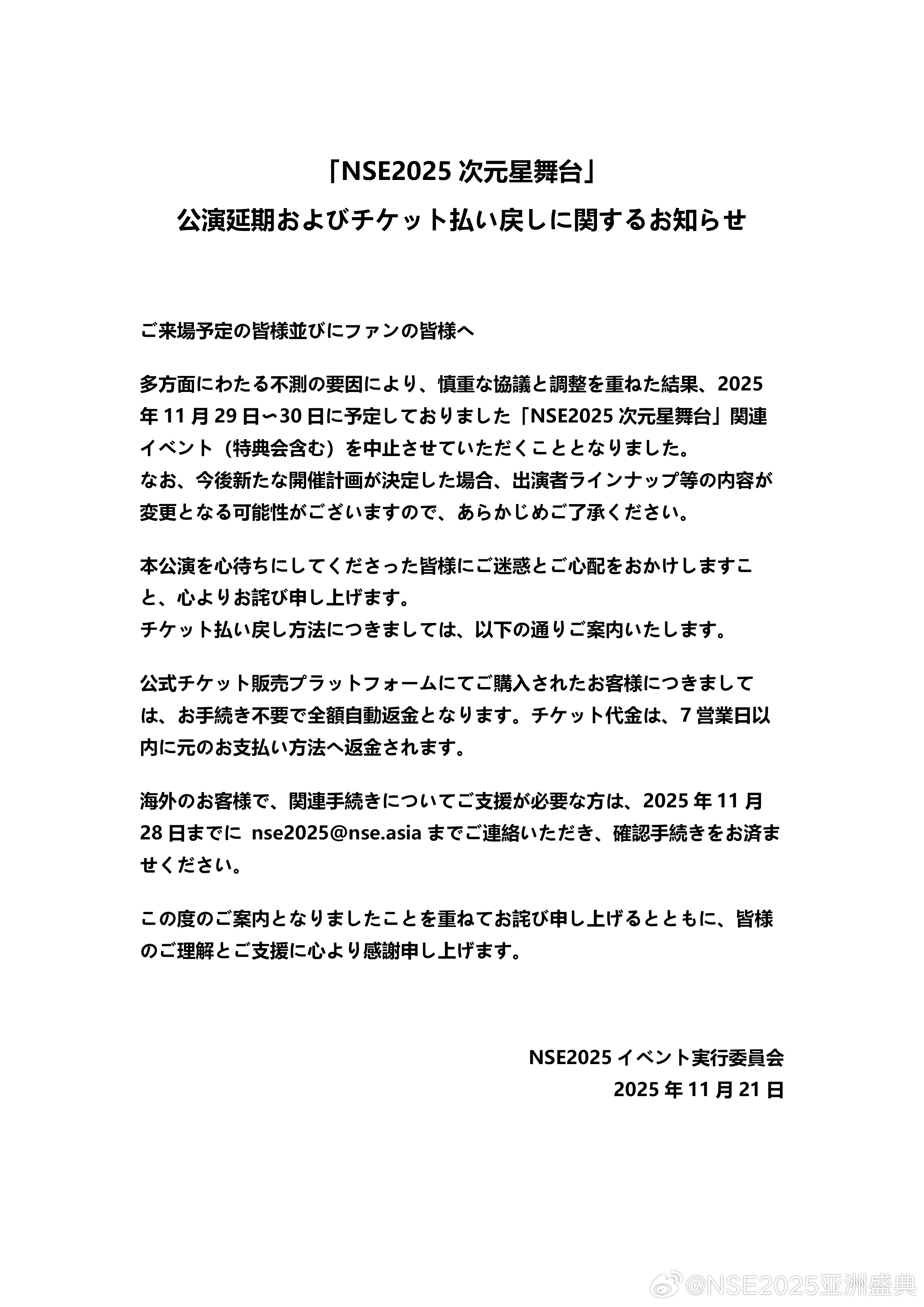「NSE2025次元星舞台」公演延期のお知らせhttps://t.co/HNAdq0ZeGV